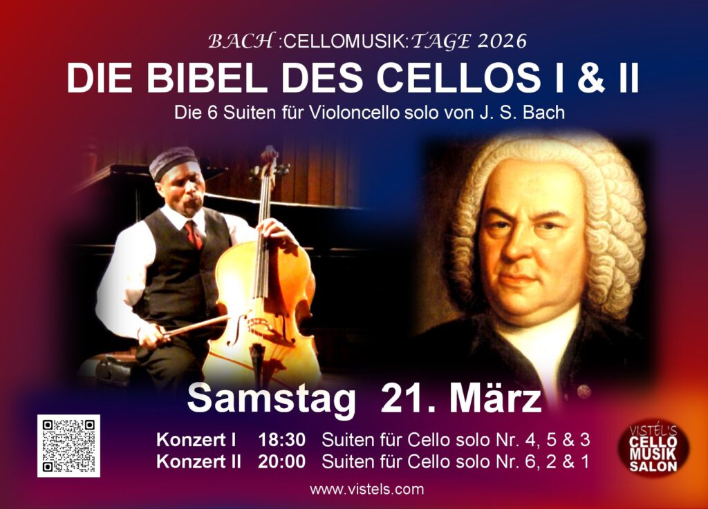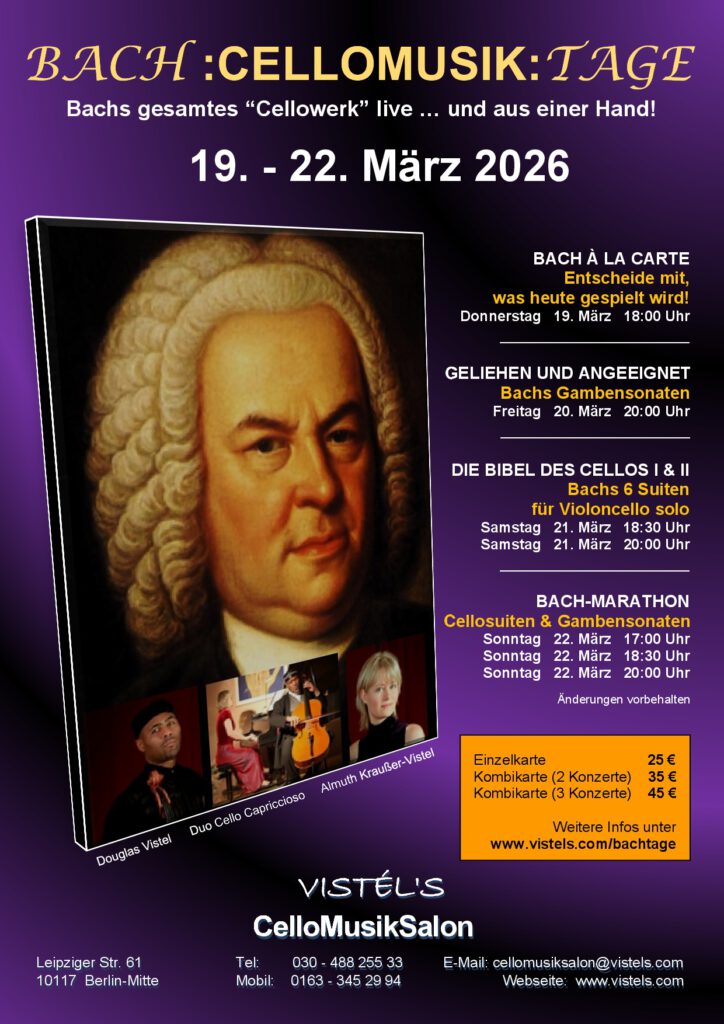 Bachs Geburtstag am 21. März wird weltweit gefeiert und es gibt unzählige Bachfeste. In Berlin veranstaltet VISTÉL’S CelloMusikSalon seit 2014 die „BACH:CELLOMUSIK:TAGE“ – ein außergewöhnliches Festival, das den Berlinern wie auch ihren Gästen die Möglichkeit bietet, Bachs gesamtes Cellowerk „aus einem Guss“ zu hören und zu erleben.