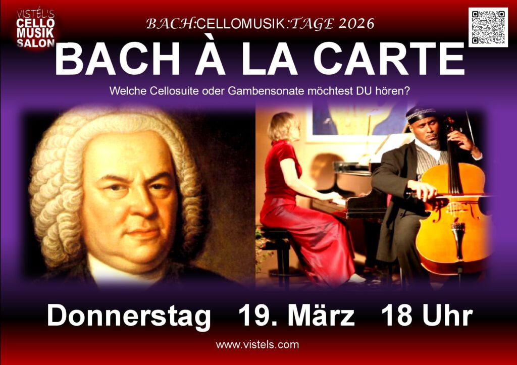 Der kubanische Cellist Douglas Vistel und die Berliner Pianistin Almuth Kraußer-Vistel, die mit ihrem CelloMusikSalon inmitten Berlins einen festen Platz für die Cellomusik geschaffen haben, mischen und ordnen die Cellosuiten und Gambensonaten neu in drei spannende, interessante und leicht zu hörende Programme, die das Publikum, je nach Belieben, als einzelnes Konzert oder als Zyklus erleben kann.