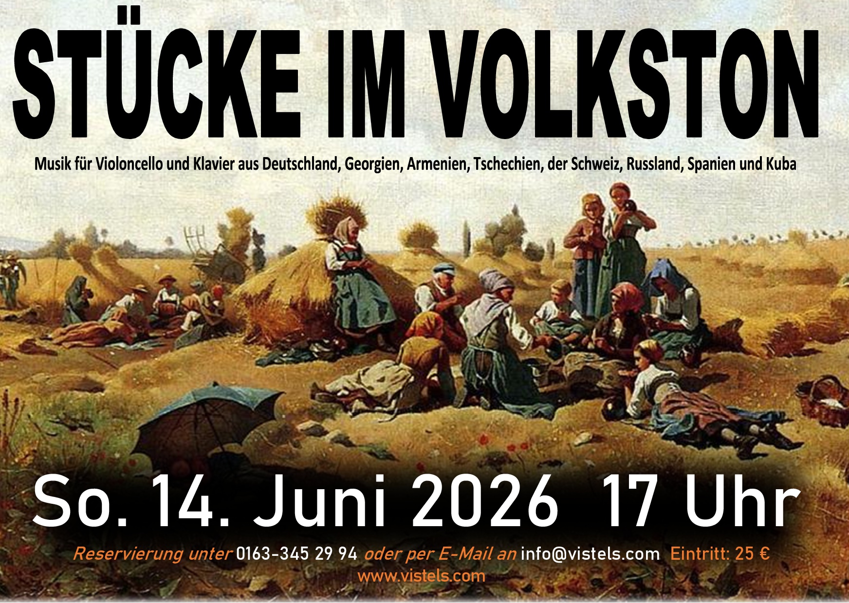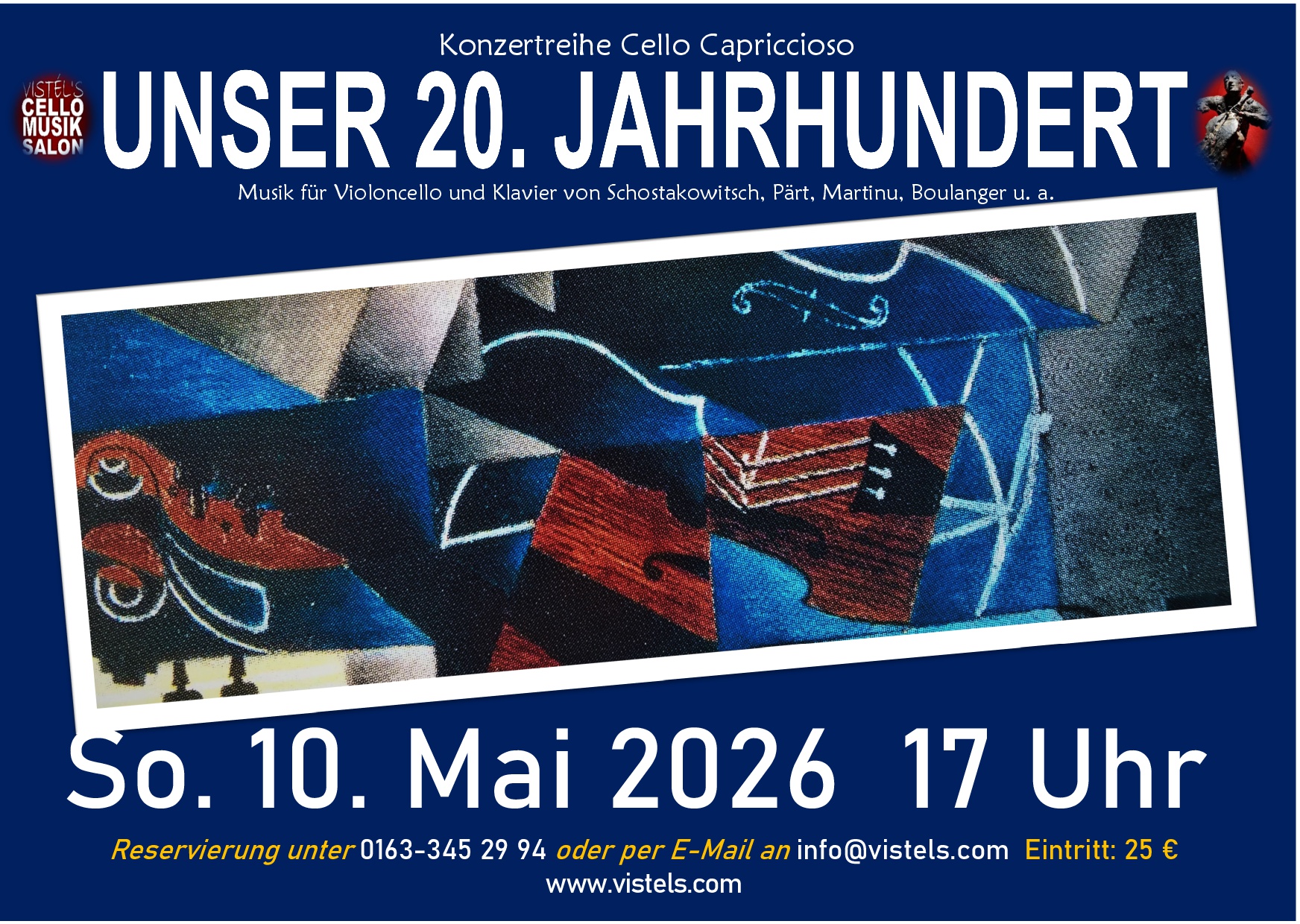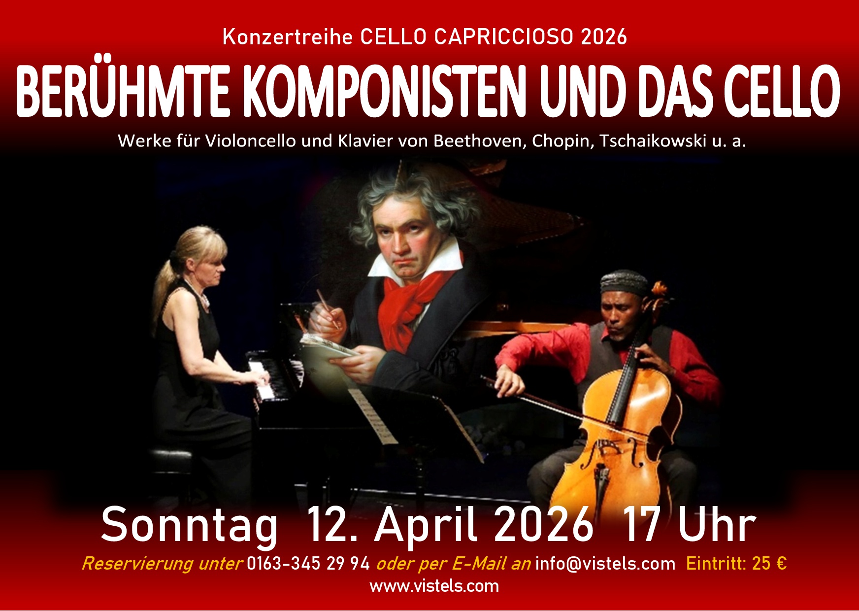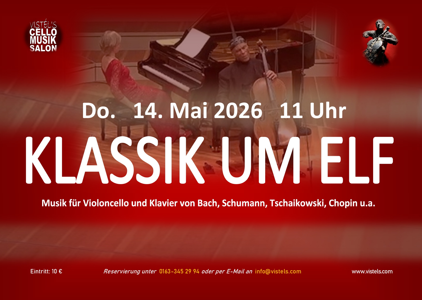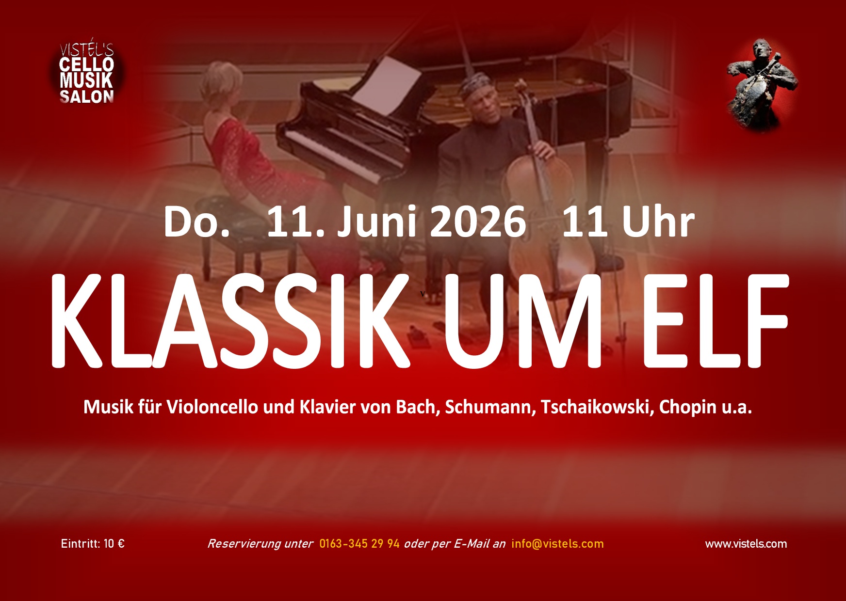 Werke für Violoncello und Klavier von Bach, Schumann, Tschaikowski, Rachmaninow u.v.m. / Einlass und Kasse: ab 10.30 Uhr / Dauer der Veranstaltung: ca. 1 Stunde / Eintritt: 10 € (Cash only) /Anmeldung unter: cellomusiksalon@vistels.com oder 0163-345 29 94