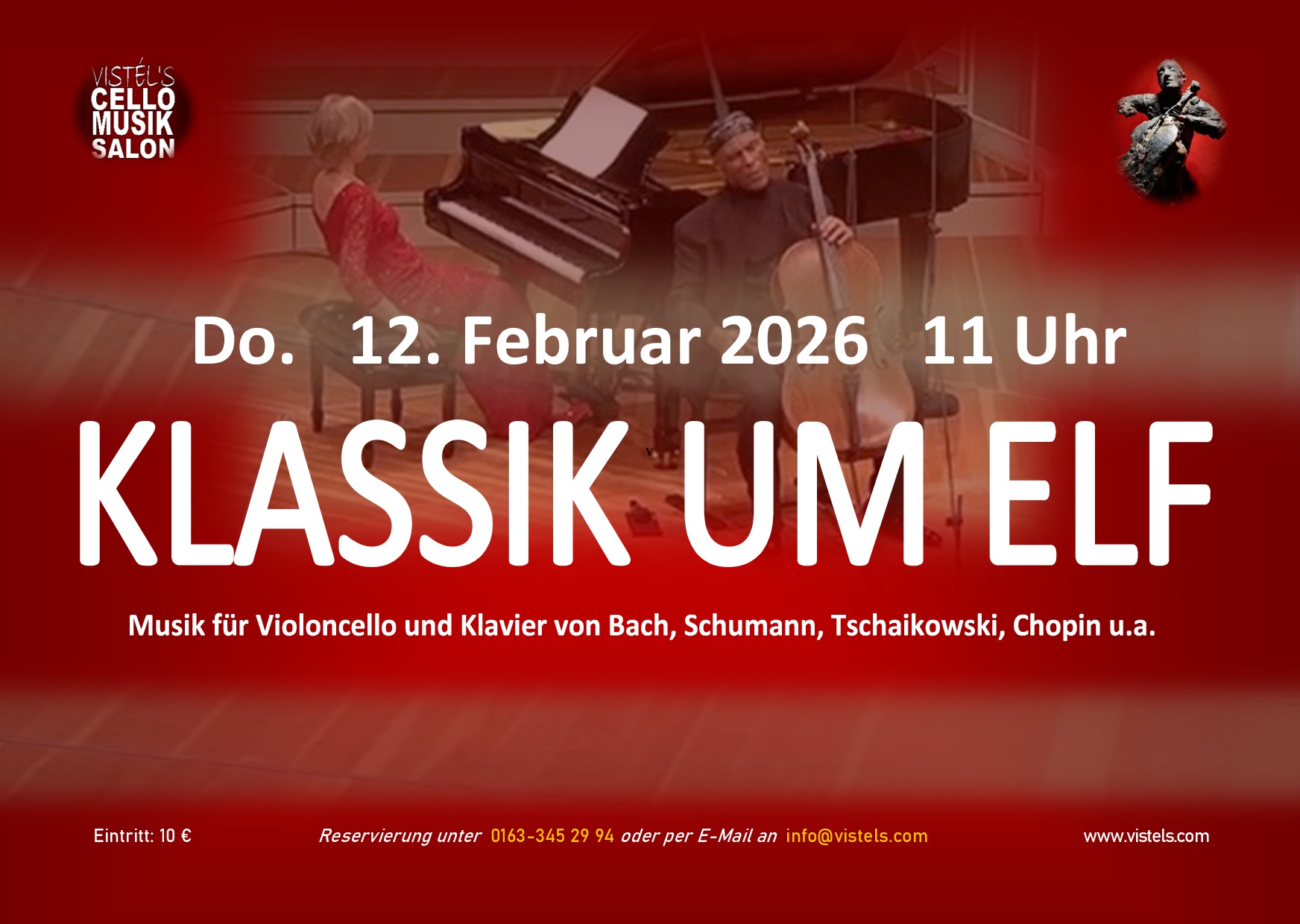 Werke für Violoncello und Klavier von Bach, Schumann, Tschaikowski, Chopin und 20 weiteren Komponisten. / Einlass und Kasse ab 10:30 Uhr / Eintritt: 10 € (Cash only) /Anmeldung unter: cellomusiksalon@vistels.com oder 0163-345 29 94