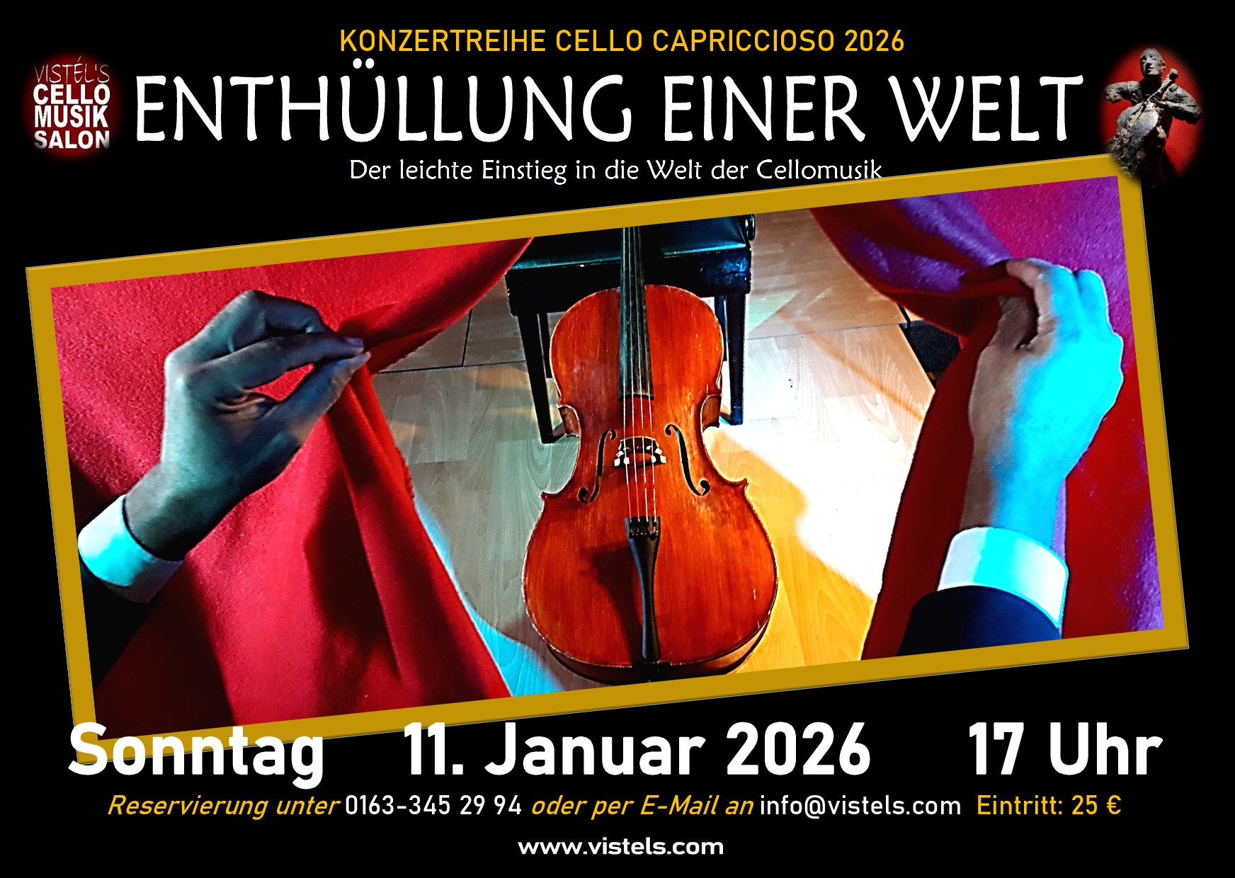 Entscheide mit, was hier gespielt wird! Einlass und Kasse ab 16:30 Uhr / Konzertbeginn: 17 Uhr / Eintritt 30 € (Cash only) /Anmeldung unter: + 163 345 29 94 oder cellomusiksalon@vistels.com